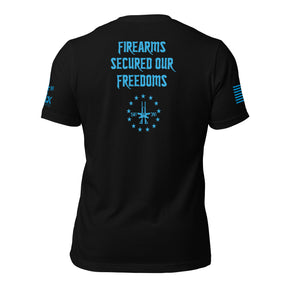 Stand tall in the "Firearms Secured Freedoms" shirt, a powerful homage to the pivotal role that firearms have played in securing and safeguarding liberty throughout history. This shirt is more than fabric and ink; it's a statement of principle, designed for those who deeply respect the foundational values of self-defense and freedom. Emblazoned with a message that highlights the instrumental role of firearms in protecting rights and freedoms, this collection speaks to the heart of the Second Amendment advocate. It's for the historians, the patriots, and the guardians of freedom who recognize that the right to bear arms is not just about personal protection; it's about preserving the liberties that our forebears fought so bravely to secure. Whether you're at the range, a historical reenactment, or a casual gathering, wearing this shirt declares your commitment to defending the freedoms that define us. Let it serve as a reminder that the liberties we enjoy today were hard-won and must be diligently preserved for generations to come.