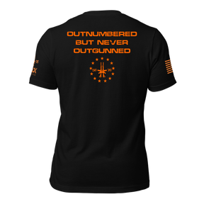 If there was ever a truly unique American shirt, this is it. "Outnumbered But Never Outgunned" t-shirt from BRICK - a symbol of resilience, defiance, and steadfast determination. This shirt communicates your resolve and commitment to fight to the end and outlast any challenge. It's more than just a garment; it's a statement of strength to the tireless spirit and tenacity being an American.