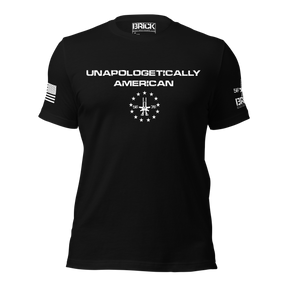 ATTENTION: PUBLIC SERVICE ANNOUNCEMENT - BRICK PRESENTS - The "Unapologetically American" t-shirt – an unabashed declaration of patriotism and loyalty. This shirt is crafted for those who are resolute in their support for the Second Amendment, a strong Military, and value Life, Liberty, and the Pursuit of Freedom. For every hard-working American, BRICK is proud to have your back. This shirt is a testament to your steadfast commitment to the core values that built this nation. Wear this t-shirt as a salute to your unwavering pride in our great country, because being American isn't just a nationality, it's about living your best life on your terms!